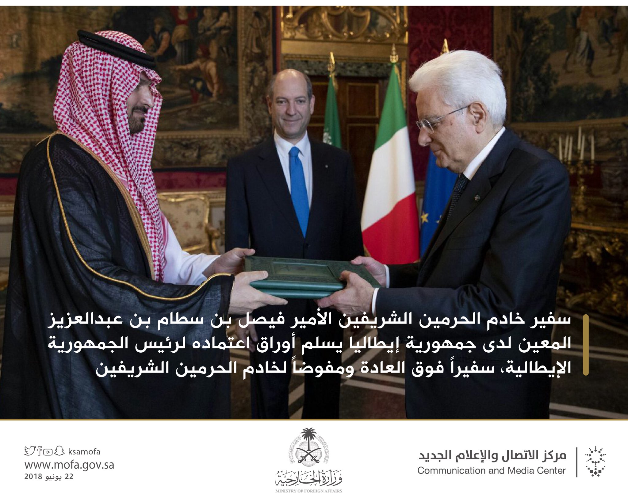 وزارة الخارجية Twitterissa سفير خادم الحرمين الشريفين الأمير فيصل بن سطام بن عبدالعزيز يسلم أوراق اعتماده لرئيس جمهورية إيطاليا